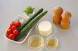 ボウルに<マリネ液>を混ぜ合わせて、キュウリ、大根を混ぜ合わせ器に盛り分け、プチトマトを添える。