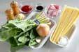 1のフライパンに2のスパゲティを加えて強火で炒めあわせ、全体に混ざれば、<調味料>を加え、全体にからまれば、ほうれん草を加えて手早く合わせる。