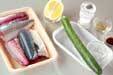レモンは4つの串切りにする。