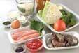 器にせん切りキャベツ、くし切りにしたトマト、ゆでたブロッコリー、フライを盛り合わせ、くし切りにしたレモン、<合わせソース>を添える。好みでキャベツにマヨネーズをかけて下さい。