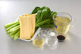 鍋にだし汁、<調味料>を入れて中火にかけ、煮立ったら油揚げを加え、3分煮て小松菜を加える。小松菜がしんなりしたら火を止める。