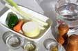 鍋に<スープ>の材料を入れて強火で煮立て、チキンブイヨンが煮溶ければ、大根、ニンジンを加える。