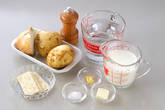 鍋にジャガイモ、玉ネギ、バター、牛乳、水、固形ブイヨン、塩を入れて中火にかけ、煮立てば、火を弱めて10分煮る。