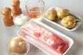 厚手の鍋に豚肉、水切りしたジャガイモ、玉ネギを入れる。塩コショウをし、ローリエをのせ、白ワインをかけ、蓋をして強火にかける。