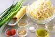 器にモヤシ、油揚げ、細ネギを盛り合わせ、<ドレッシング>をかける。
