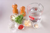 <スープ>の材料、クコの実を入れて強火にかけ、ひと煮立ちさせる。