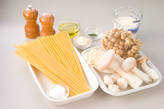フライパンにオリーブ油を強火にかけ、キノコ類を炒め、少ししんなりすれば塩コショウを強めにふりかけ、生クリームを加えて2分位煮詰める。