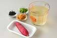 サツマイモは両端を切り落とし、皮ごときれいに洗う。1cm幅に切り、水に放つ。大きい場合は更に半分に切り、半月切りにする。