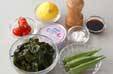 器にワカメを敷き、ツナをほぐしてワカメにのせ、オクラ、プチトマトを散らす。