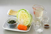 鍋にだし汁と<調味料>を入れ強火にかける。煮立てばキャベツ、ニンジンを入れ、蓋をしてキャベツがしんなりするまで煮る。(煮立てば弱めの中火にして煮ます)
