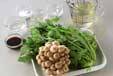 鍋にだし汁、<調味料>を加えて火にかけ、煮立てば、シメジを加える。
