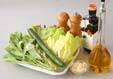 ルッコラは根元を少し切り落とし、サニーレタスに合わせてちぎり、冷水に通して水気を切る。