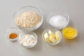 2のボウルにオートミール、薄力粉、シナモンパウダーを加えて大きめのスプーンでサックリと混ぜ合わせる。