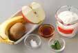 リンゴは皮ごときれいに水洗いし、4つのくし切りにして芯を取り、一口大の乱切りにし、塩水に放ってから水気を拭き取る。