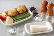 残りのサラダ油大1を加え、強火でニンニクの芽を炒め、鮮やかな緑になれば、水切りしたジャガイモ、水煮タケノコを炒めあわせる。