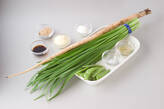 たっぷりの熱湯に塩少々を加えキヌサヤをゆでてすぐに水に取り、大きいものは斜め切りにする。同じ熱湯でニラを入れ、サッとゆでて水に取り、水気を絞って3cmの長さに切る。