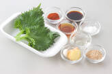 大葉の両面に<合わせ調味料>をつけながら、1枚づつ容器に重ねる。