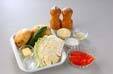 キュウリは縦縞になるように所々ピーラーで皮をむき、薄い輪切りにし、キャベツはせん切りにして合わせ、塩少々でもみ、しんなりしたら水洗いして水気を絞る。