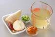ミョウガは薄い輪切りにして水に放ち、ザルに上げる。
