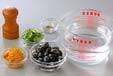 砂出しシジミは、塩水で殻と殻をこすり合わせるようにして汚れを洗い、ザルに上げる。