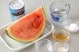 スイカは皮をむき、くり抜くか、ひとくち大に切って種を取り、半量をミキサーにかけ網を通し、300mlのジュースを取る。