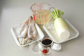 イカは足を引き抜き、胴は洗って1.5cm幅に切る。足は目とワタを切り落として口を取り除く。足先を切り揃え、2本づつに切り分ける。