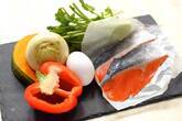 (4)の野菜と(5)の鮭を器に盛り、(6)のソースをかける。