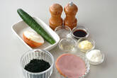 <和えソース>のボウルに1、ハム、キュウリ、玉ネギを加え、全体に混ぜ合わせる。