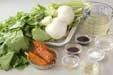 葉が柔らかい場合はきれいに水洗いして4cmの長さに刻む。葉がかたい場合は塩を入れた熱湯でゆで、水に取って粗熱が取れれば水気を絞り、4cmの長さに切る。