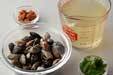 アサリは殻と殻をこすり合わせるように水洗いして、ザルに上げておく。
