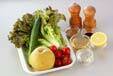 梨、サニーレタス、キュウリ、プチトマトをサッと混ぜ合わせて器に盛り、よく混ぜ合わせた<ドレッシング>を掛ける。