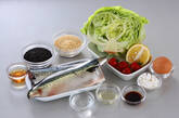 器にレタス、2の揚げサバを盛り合わせ、プチトマト、レモンを添える。