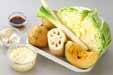 アルミホイルにキャベツ、カボチャ、水切りしたレンコン、ジャガイモ、白ネギ、ニンニクをそれぞれのせ、ホイルできっちりと包む。