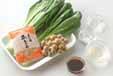 青菜は特に根元をきれいに水洗いし、たっぷりの熱湯でサッとゆでて水に取り、粗熱が取れれば水気を絞り、根元を少し切り落とし、3cmの長さに切る。