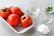 トマトはヘタをくり抜き、熱湯につけて皮が少し破れれば、すぐに冷水にとって皮をむき、切り離さないように6~8つに切り込みを入れる。