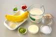 生クリームを泡立て器で軽くトロミがつく位に泡立てる。バナナは皮をむき、ひとくち大に切ってフォークで細かくつぶし、レモン汁をからめて変色を防ぐ。生クリームと混ぜ合わせ、プリンに掛け、金時豆を添え、あったらミントの葉をのせる。