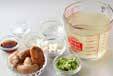 生シイタケは石づきを切り落とし、軸と笠に切り分ける。笠は堅く絞ったぬれ布巾で汚れを拭き取り、薄切りにし、軸は縦に裂く。