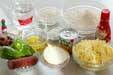 <ピザ生地>を作る。ボウルに薄力粉と強力粉を入れ、中央に砂糖とドライイーストを入れて中央をへこませる。ぬるま湯1/2量、オリーブ油大2を加え、手で全体がポロポロ状になるまで混ぜ合わせる。