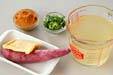 鍋にだし汁、水気を切ったサツマイモを入れて中火にかける。煮立てば火を少し弱める。サツマイモに少し透明感が出てくれば、油揚げを加える。