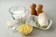 エノキがしんなりすれば牛乳、固形ブイヨンを入れ、固形ブイヨンが煮溶ければ、クリームコーンを加える。