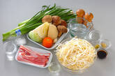 豚バラ肉の色が変わったら、モヤシ、キャベツ、白ネギ、ニンジンを炒め合わせ、更に水煮タケノコ、生シイタケを炒め合わせる。