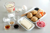 ジャガイモに、1の具を加えて混ぜ合わせ、冷ましておく。揚げ油を170℃に予熱しはじめる。
