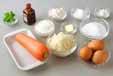 ボウルに卵白、すりおろしたニンジン、アーモンドプードル、プレーンヨーグルト、グラニュー糖50gを入れ、泡立てないようによく混ぜ合わせる。