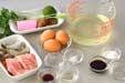 器に鶏肉、エビ、薄切りにしたカマボコ、生シイタケを入れ、卵液を静かに注ぐ。