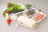 春巻きの皮は半分に切って長方形にする。春巻きの皮に<エビ種>、<鶏種>を等分に分け細く巻き、小麦粉のりで巻き終わりをしっかり止める。170℃に熱した揚げ油で、カリッと美味しそうなキツネ色に揚げ、油をきる。