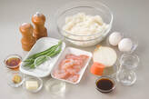 むきエビは背ワタをとり、塩水で洗い、水気を拭き取り<下味調味料>をからめる。玉ネギはみじん切りにする。ニンジンは皮をむきみじん切りにする。サヤインゲンは軸側を少し切り落とし、塩を入れた熱湯で一緒に(ニンジン、インゲン)ゆで、サヤインゲンは1cmの長さに切る。卵は割りほぐす。ショウガは皮をむき、みじん切りにする。
