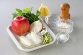 リンゴは皮ごときれいに水洗いする。イカに合わせて切り、塩水に放ちザルに上げる。