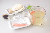 鍋にだし汁を入れて強火にかけ、煮立てば<調味料>を加え、薄く片栗粉をまぶしたささ身に加える。