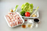 (2)の手羽元の汁気を拭き取り、ゆっくり表面がパリッとなる位まで約7~8分揚げ、油をきる。器にレタスを敷いて盛り、2の<合わせ調味料>を全体にかける。大葉をのせ、トマトを添える。