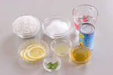 器に盛り分け、冷やした<シロップ>を注ぎ、氷、レモンの薄切り、あればミントの葉を添える。